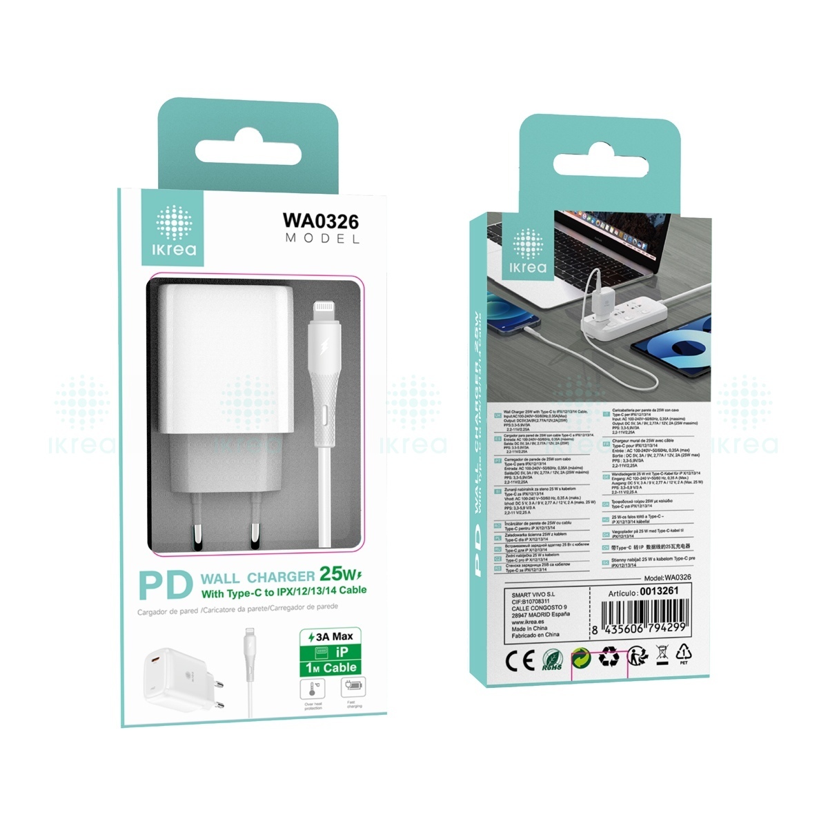 IKREA WA0326 CARGADOR PD CON CABLE TYPE-C TO LIGHTNING 25W 3A MAX BLANCO
