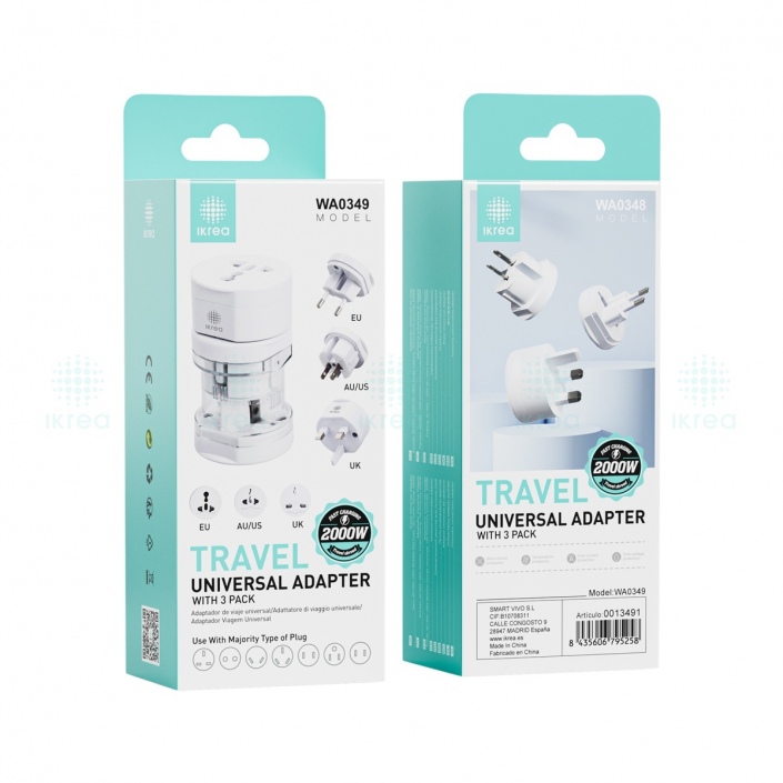 IKREA WA0349 ADAPTADOR DE VIAJE UNIVERSAL 3 EN 1 EU/AU/US/UK 2000W MAX BLANCO