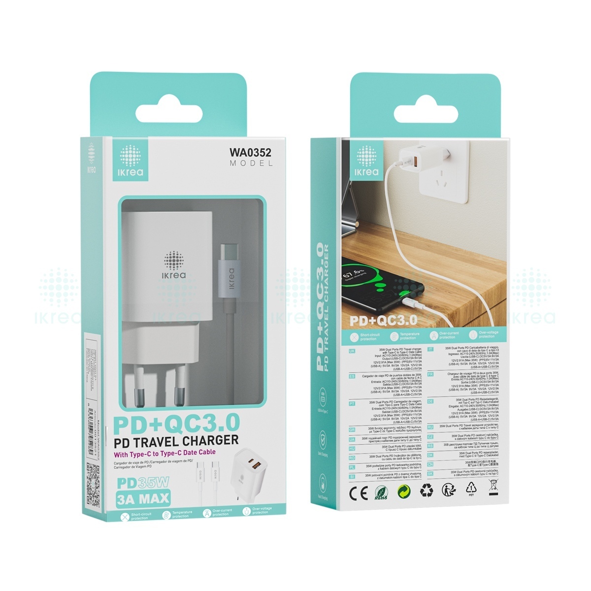 IKREA WA0352 CARGADOR 2 PUERTOS PD+QC3.0 CON CABLE TYPE-C TO TYPE-C 35W 3A MAX BLANCO