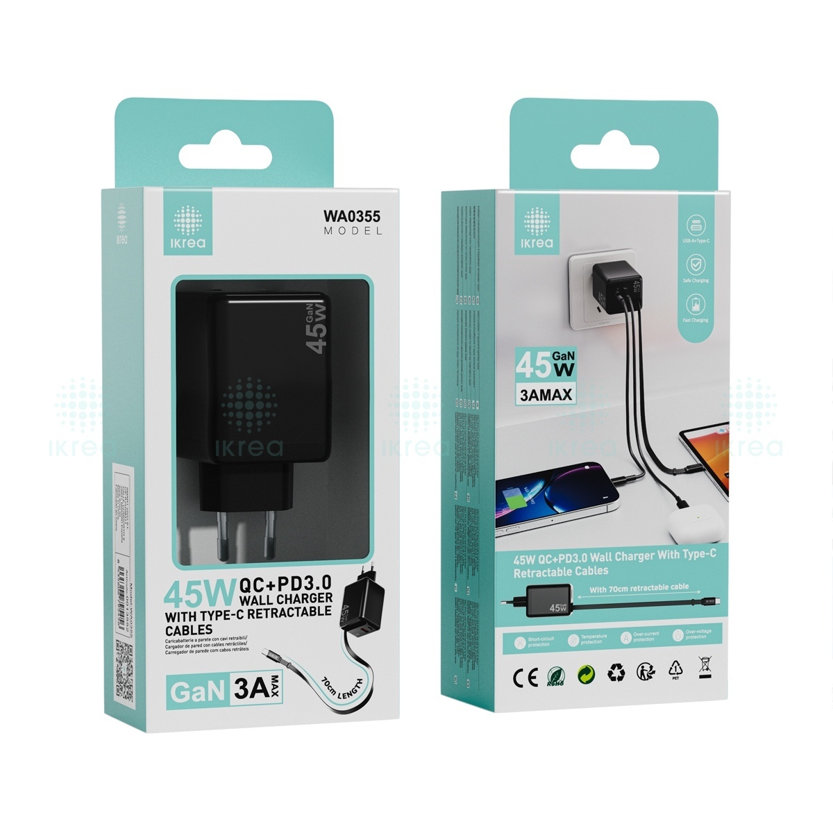 IKREA WA0355 CARGADOR 2 PUERTOS QC+PD3.0 CON CABLE TYPE-C RETRÁCTILES 45W GAN 3A MAX NEGRO