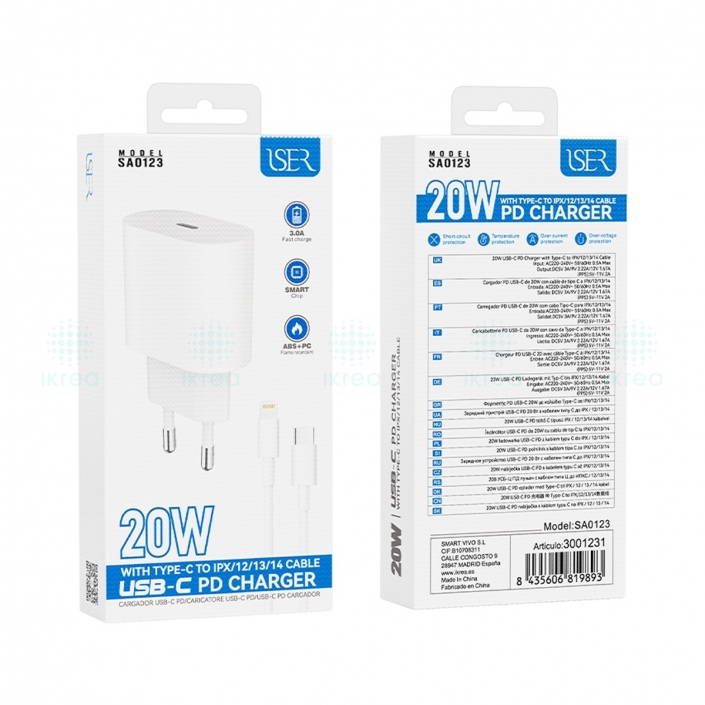ISER SA0123 CARGADOR USB-C PD CON CABLE TYPE-C TO LIGHTNING 20W 3A BLANCO